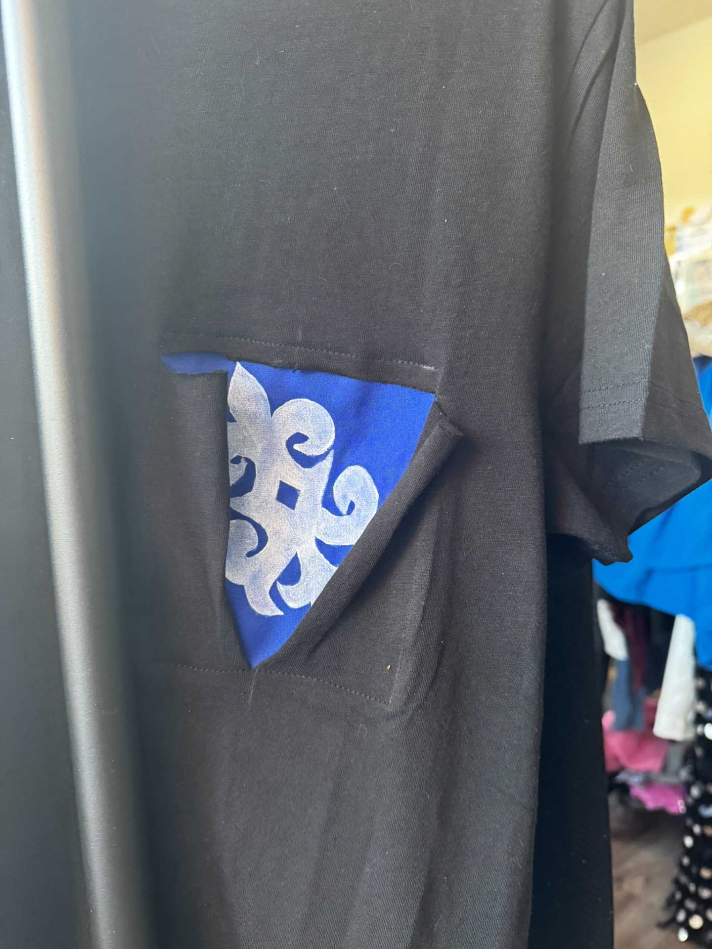 A fekete, prémium minőségű pamutból készült póló mellzsebét kézzel festett motívum díszíti, amely a márka szimbolikus, barokk ihletésű mintáit idézi.