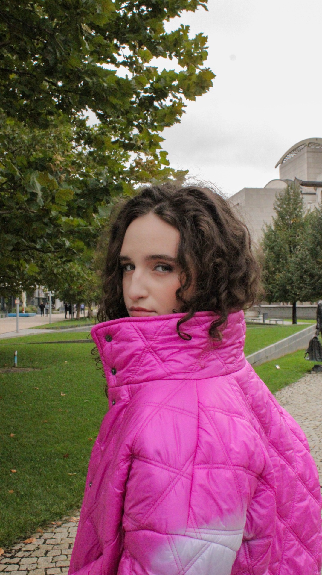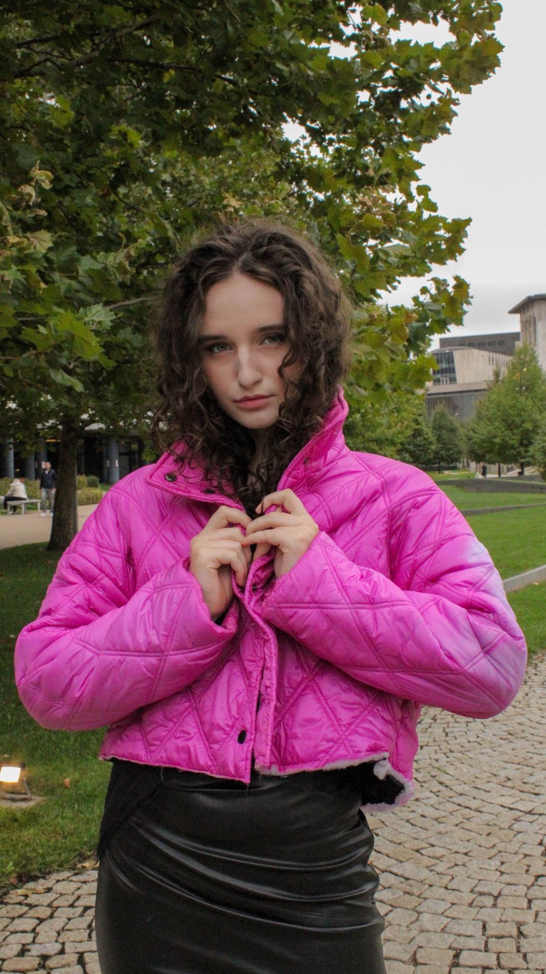 A fukszia árnyalatú, rövid fazonú, steppelt kabát a merész önkifejezés eszköze: egyszerre fiatalos és elegáns, könnyed, mégis határozott. A kabát strukturált szabása kiemeli a vállakat, miközben a puha, könnyű anyag mozgás közben is természetes komfortot biztosít.