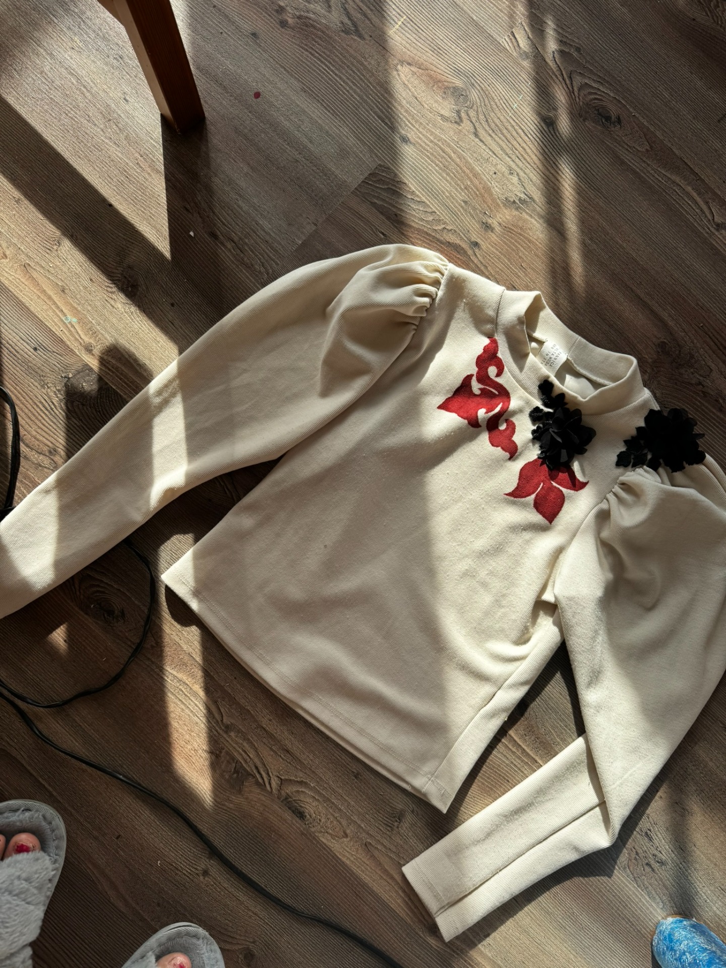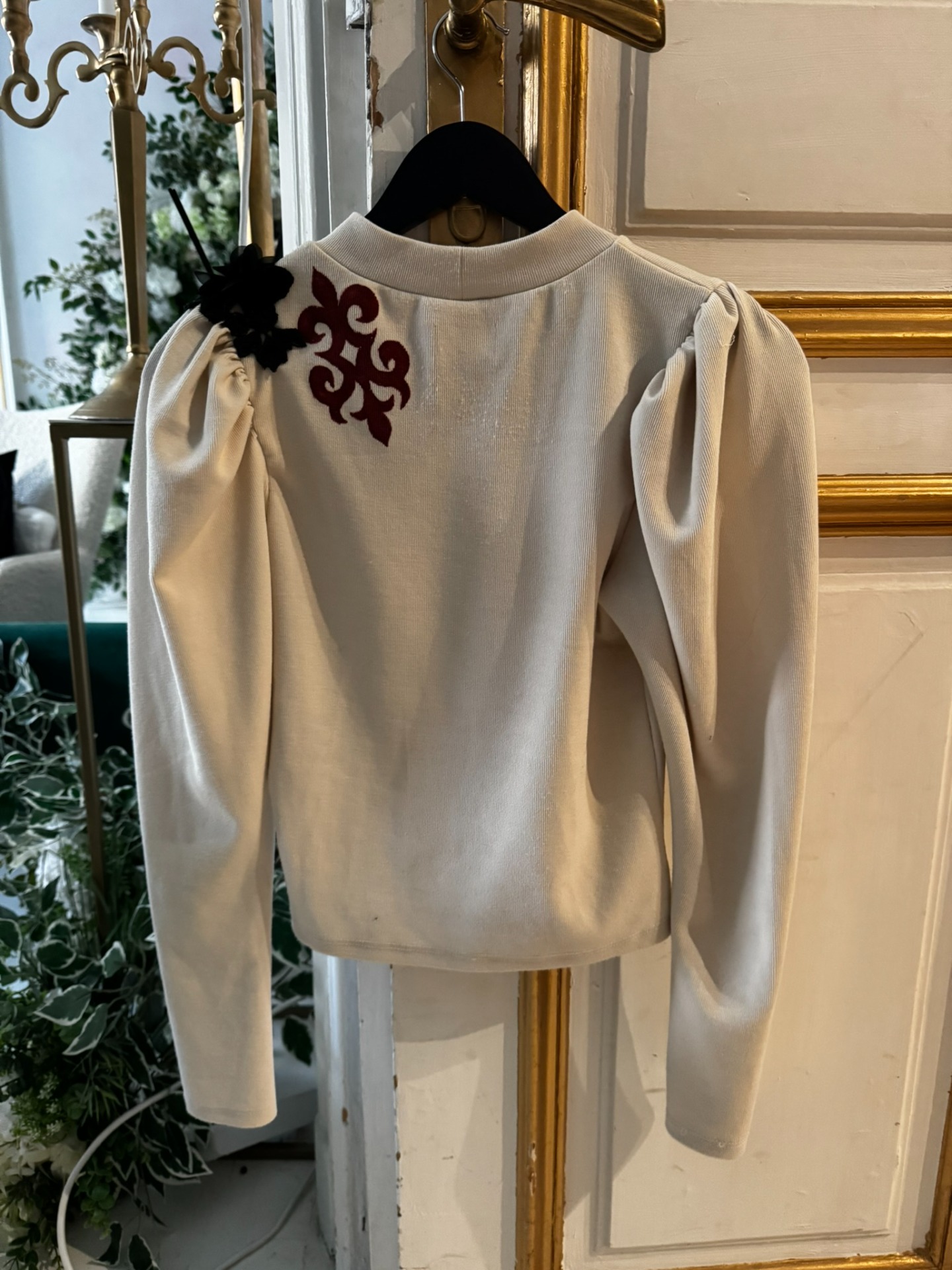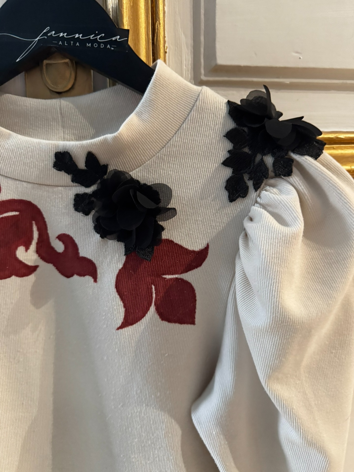 A krémszínű, lágyan strukturált anyag letisztult alapot ad a vállnál megjelenő 3D virágapplikációknak és a mélybordó ornamentikának, amelyek egyszerre szimbolizálják az újjászületést és az időtlen női szépséget.