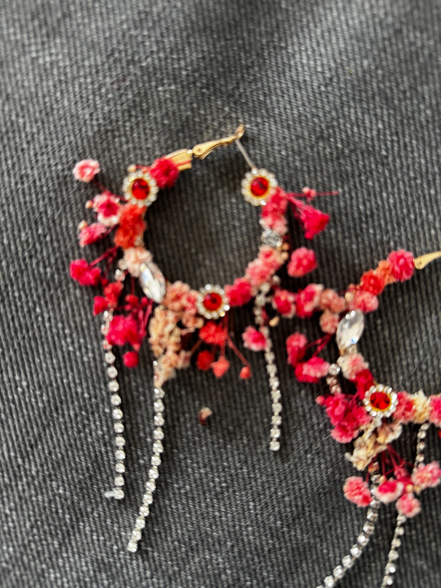 A kézzel szárított és festett virágok, a ragyogó kristályláncok és a vörös ékkövek kontrasztja egyszerre hoz létre romantikus és drámai hatást.