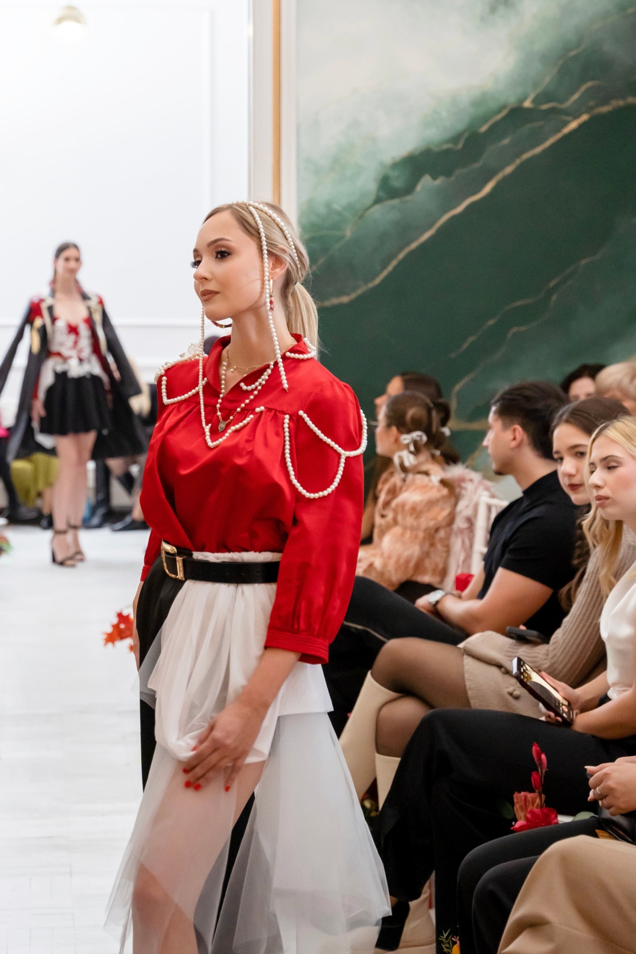 Az Ombra Blu nadrág a csendes kifinomultság és az érzelmi mélység megtestesítője. Luxusminőségű, mélyfekete szaténból készült, amely a mozgással együtt lágyan játszik a fénnyel. A láb mentén kézzel hímzett tengerészkék virágapplikációk organikus ritmust rajzolnak – egy couture részlet, amely a belső erőt és rejtett nyugalmat szimbolizálja. Minden darab Budapesten készül, olasz alapanyagok felhasználásával.