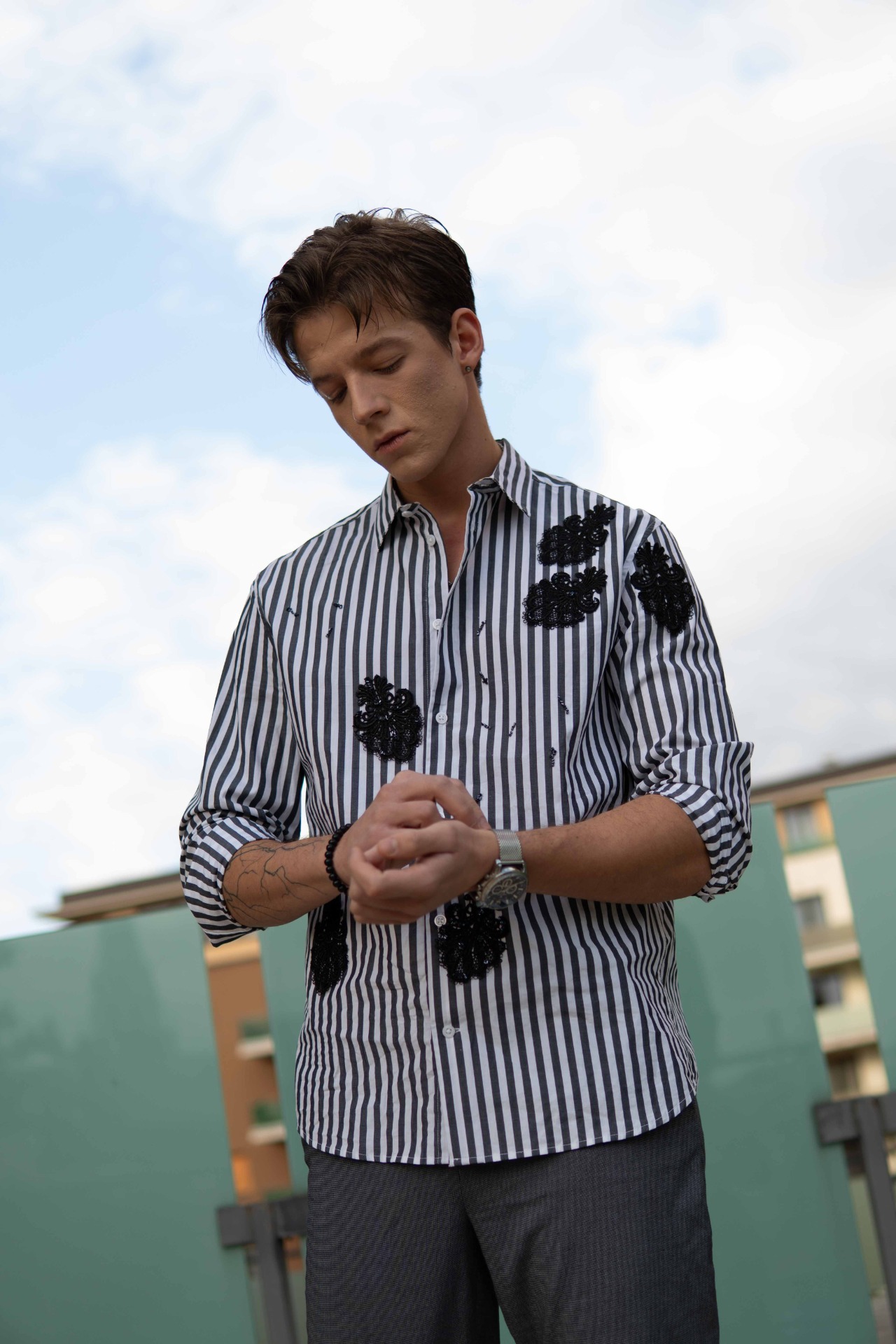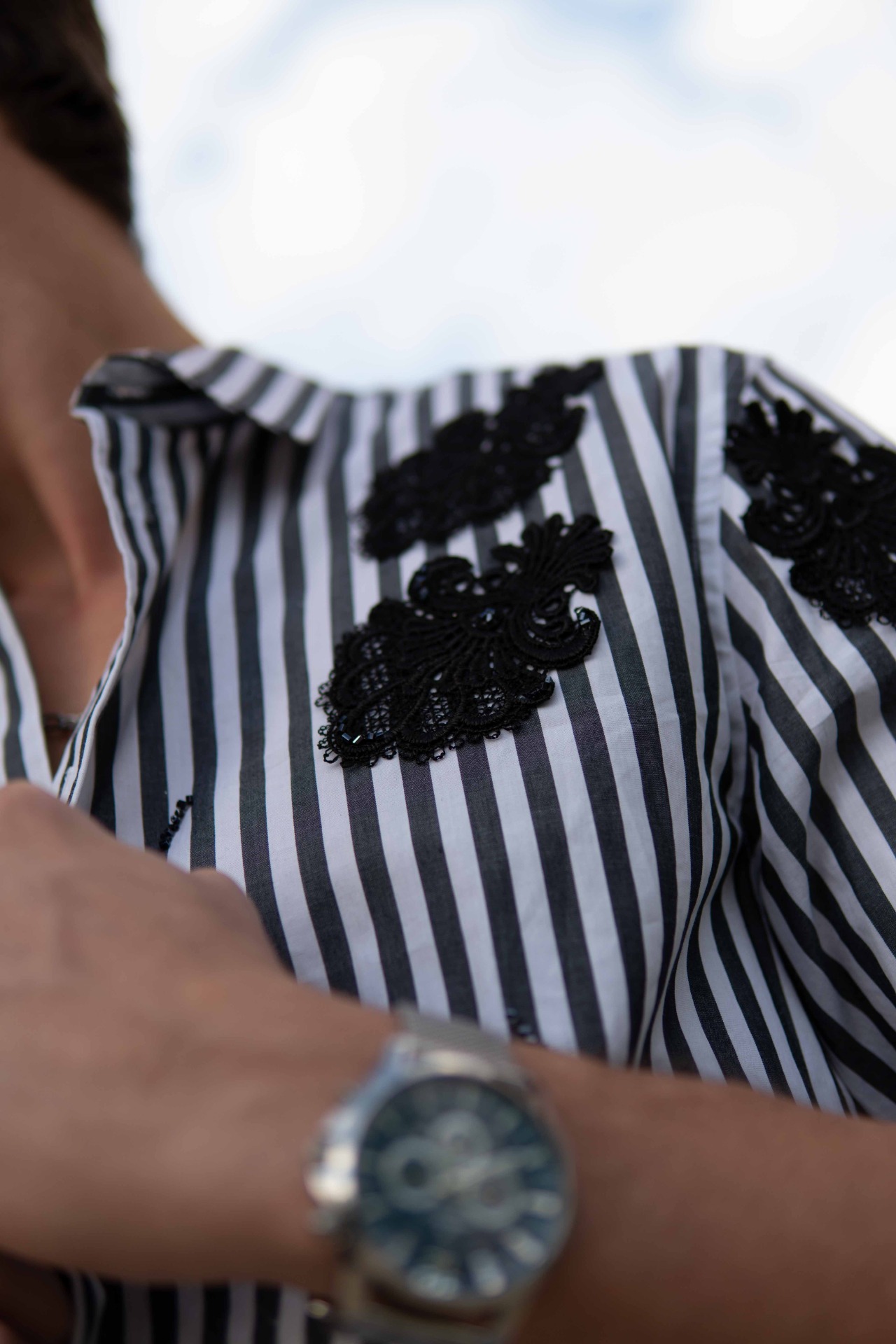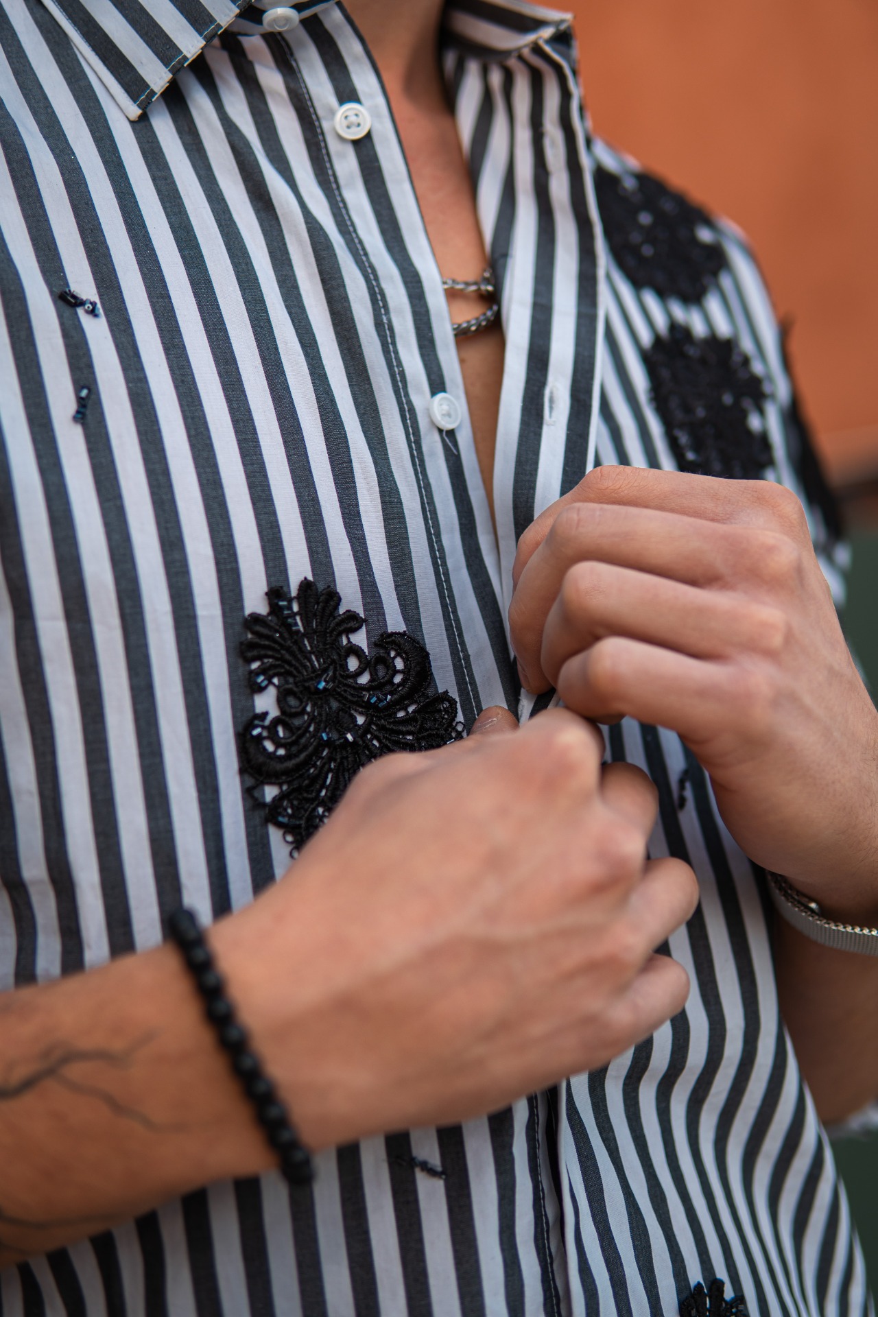 A függőleges csíkozás határozottságot és tartást kölcsönöz, míg a kézzel felhelyezett fekete hímzések a tökéletlenség szépségét és a rejtett érzékenységet szimbolizálják.