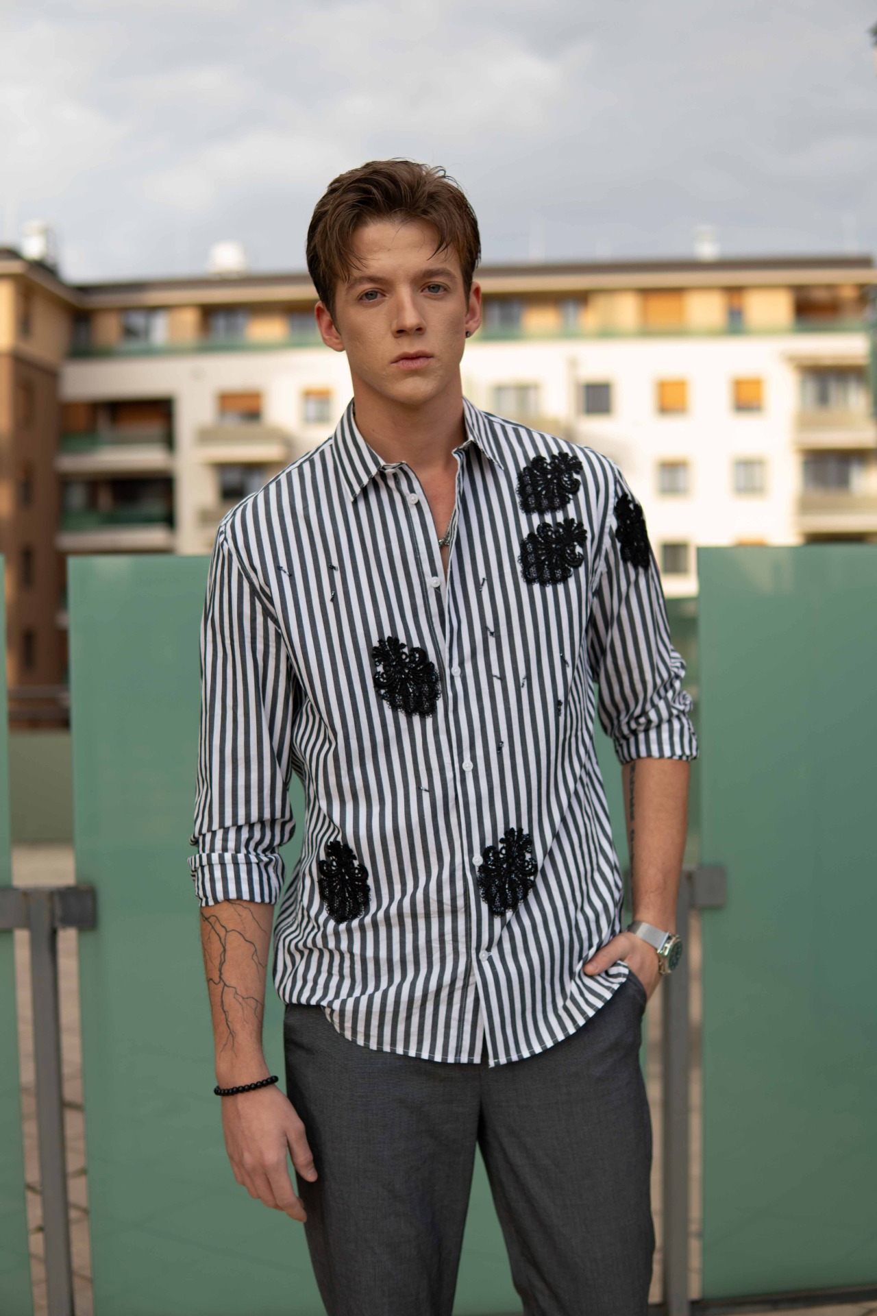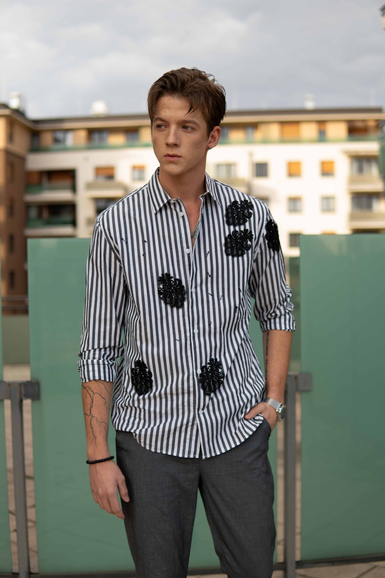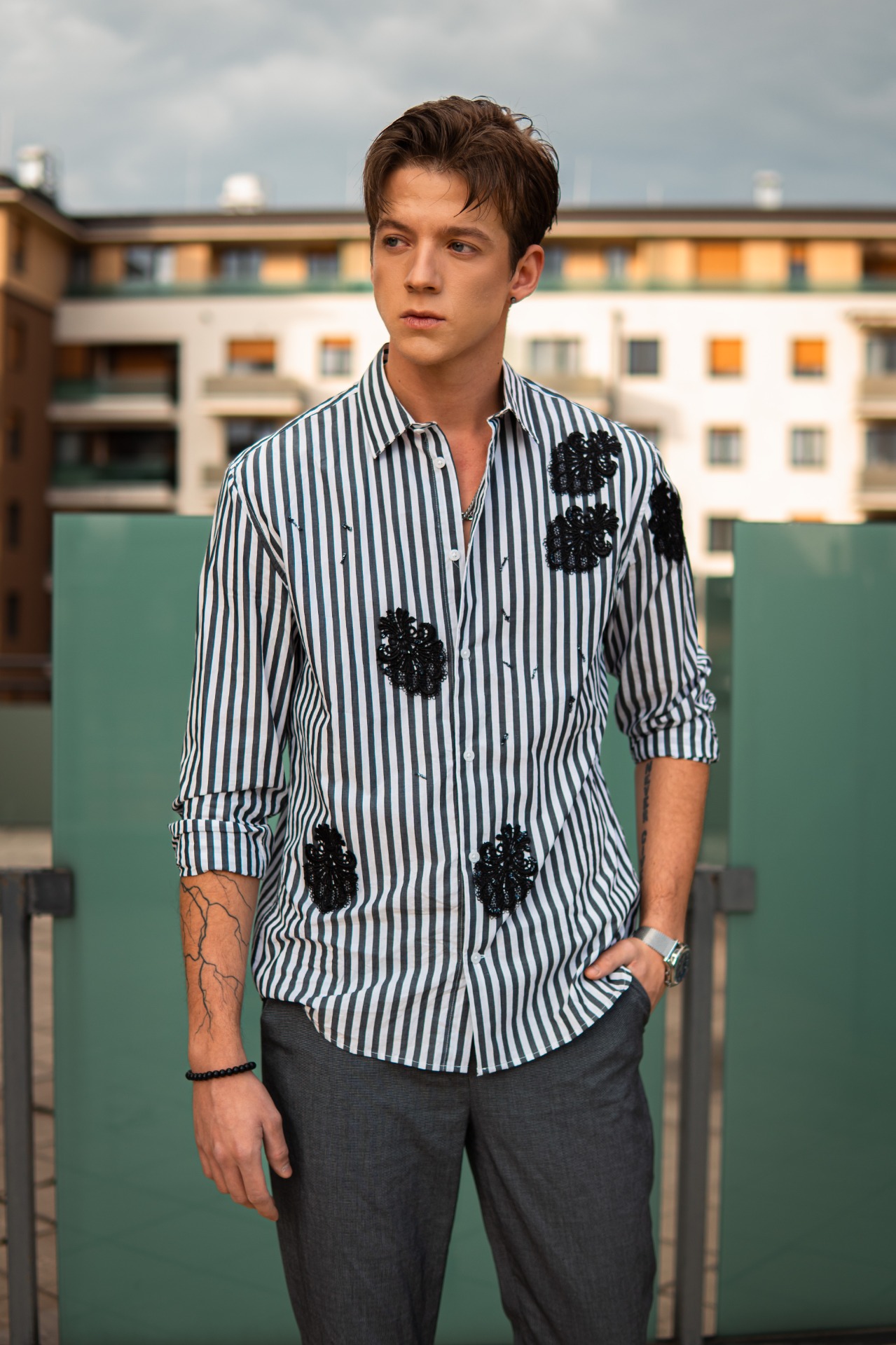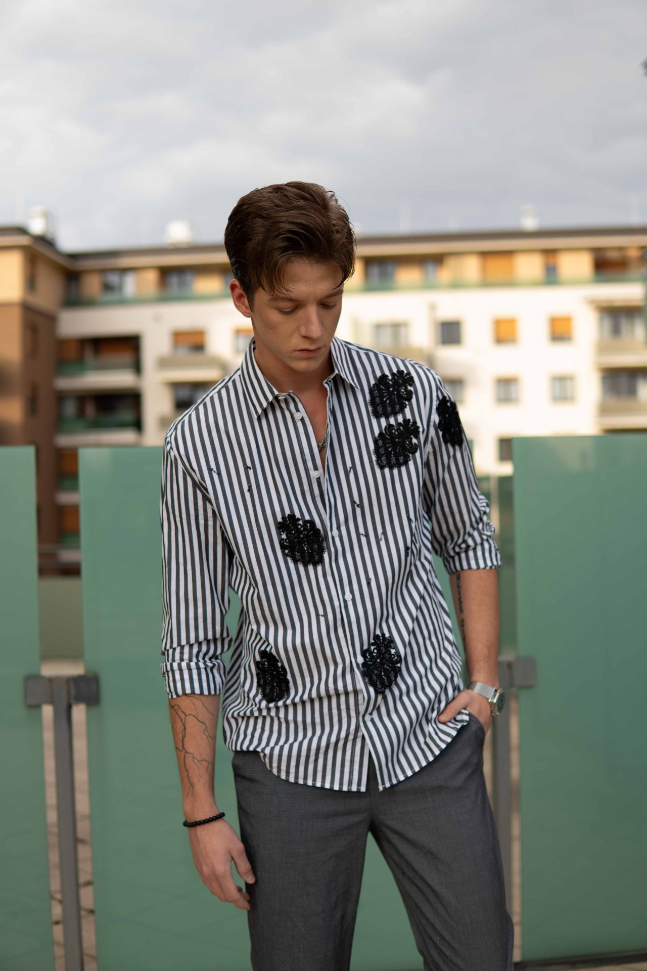 A függőleges csíkozás határozottságot és tartást kölcsönöz, míg a kézzel felhelyezett fekete hímzések a tökéletlenség szépségét és a rejtett érzékenységet szimbolizálják.