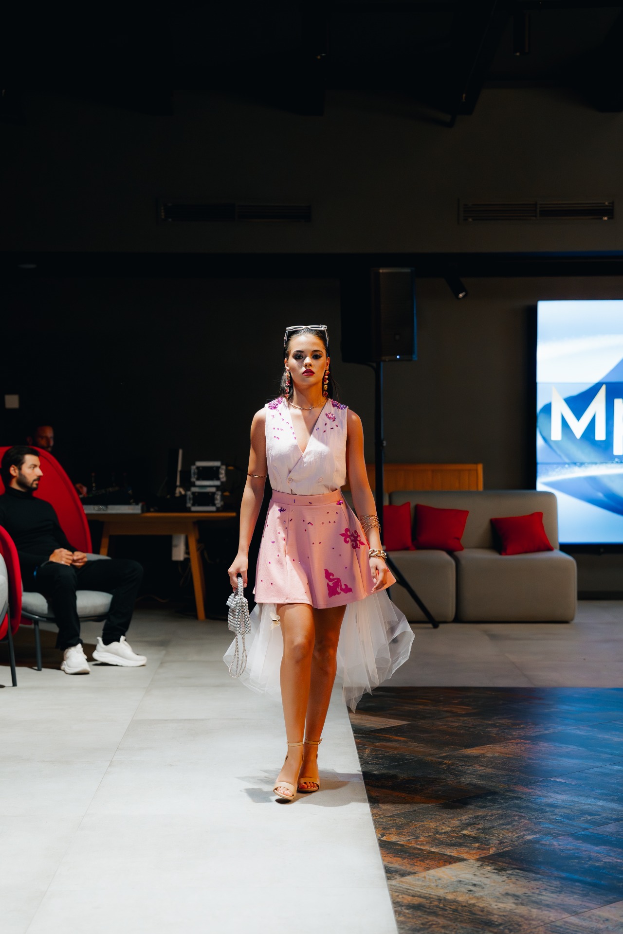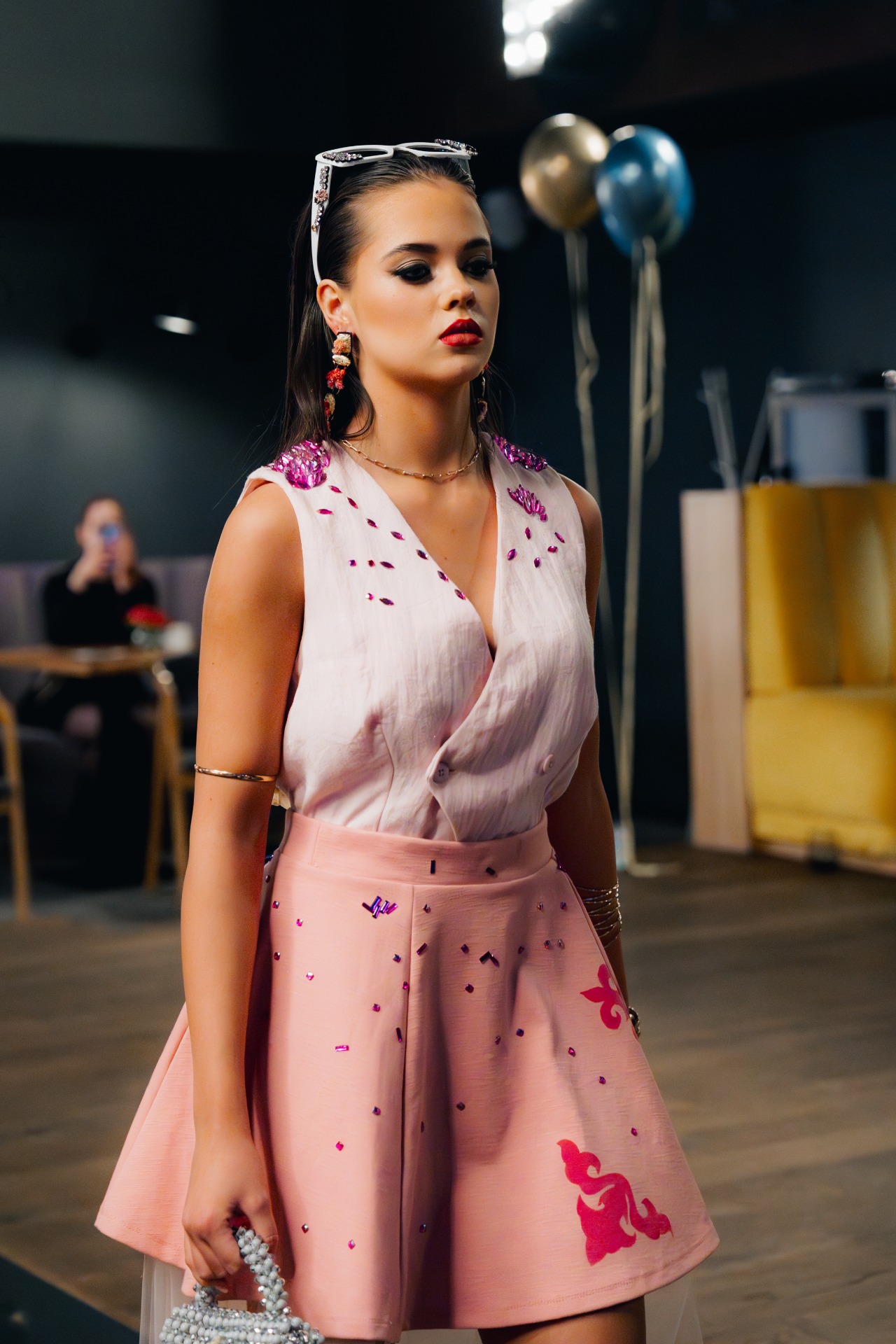 A lágy, rózsaszín árnyalatú mellény különleges kézi gyöngyözéssel és pink kristálydíszítéssel készült, amelyek finoman csillognak a fényben, megidézve a napfelkelte első sugarait.