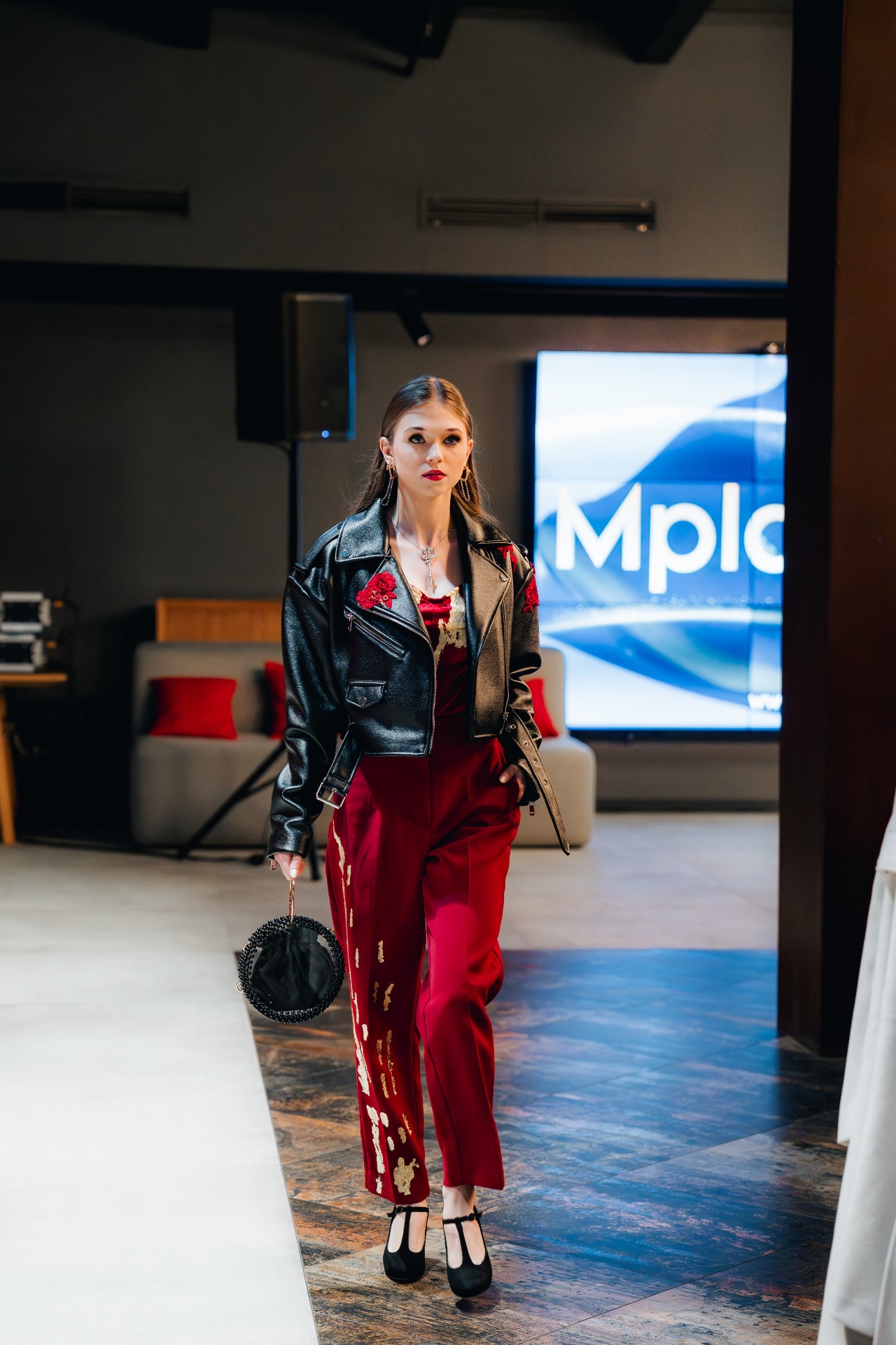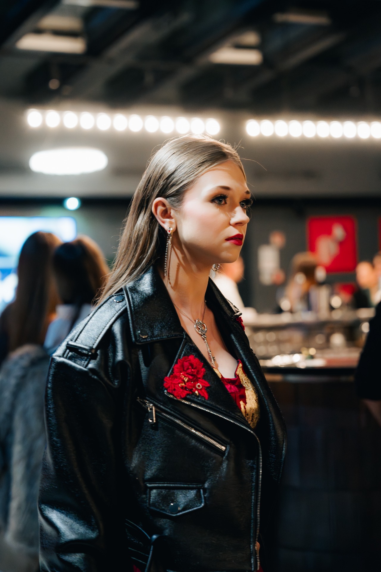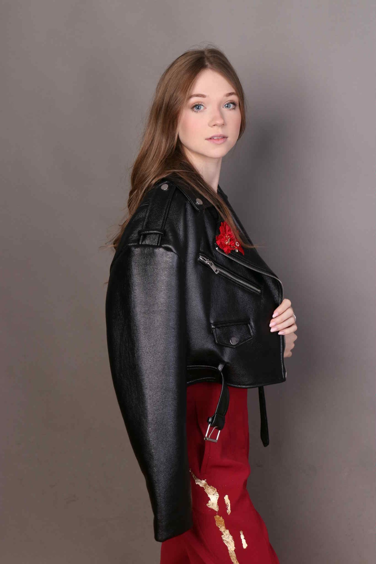 A vegán bőrből készült, rövid fazonú kabát a lázadás és érzékenység kettősségét testesíti meg. A vállakat és a mellrészt díszítő kézzel applikált piros hímzések a belső szenvedélyt és a női erő finom megnyilvánulásait idézik.